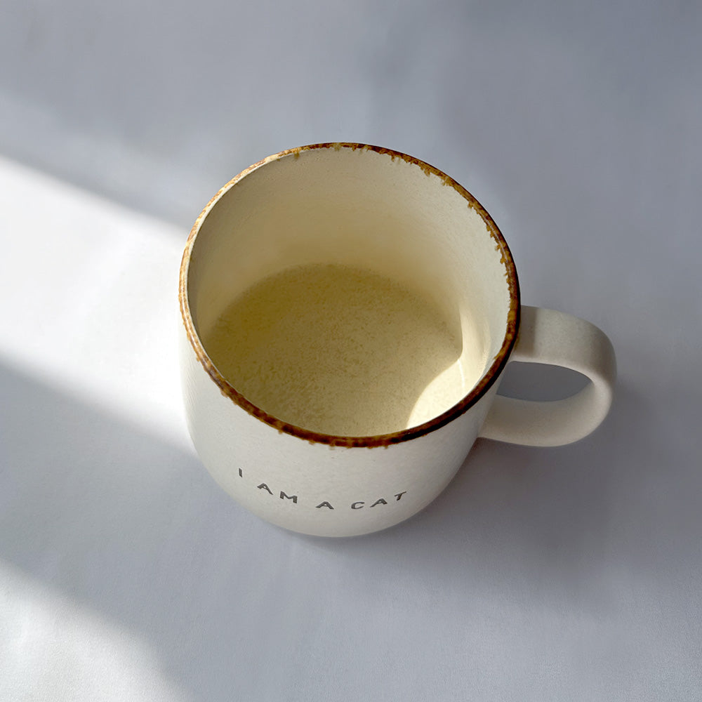 温かみのあるマットな質感とアイボリーのボディにI AM A CATのロゴが入ったシンプルなデザイン。