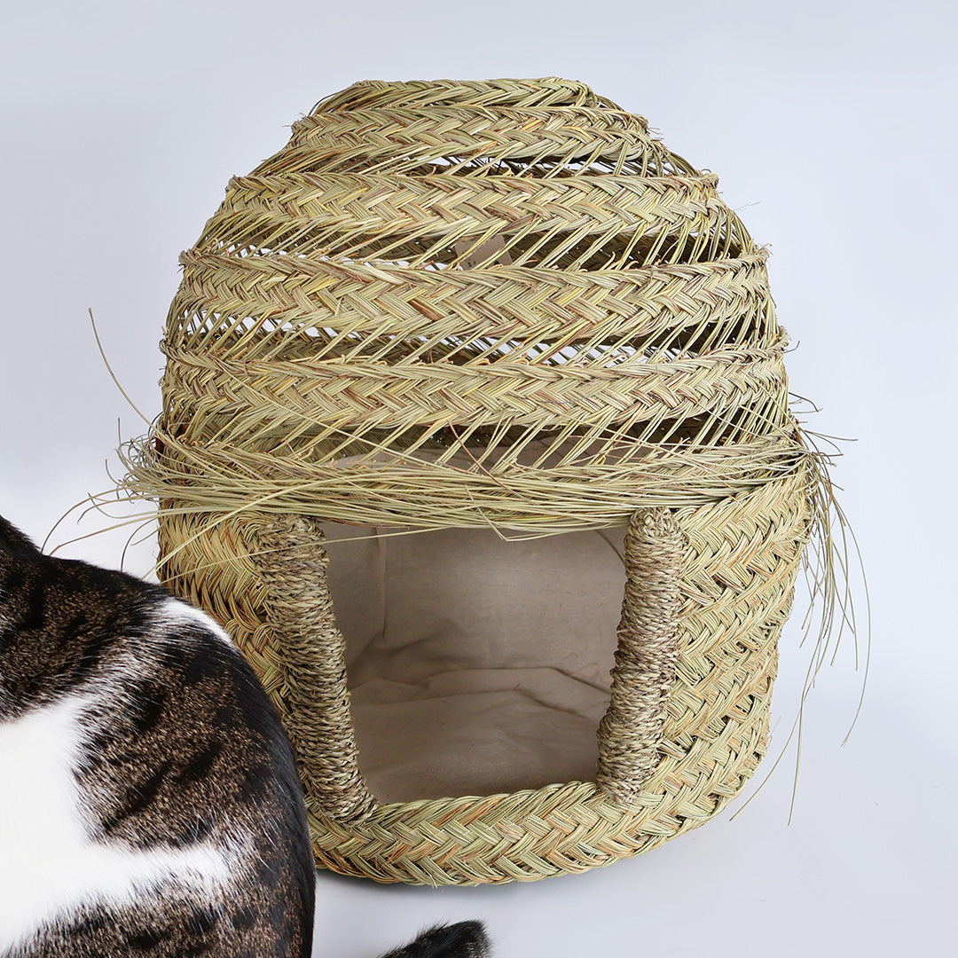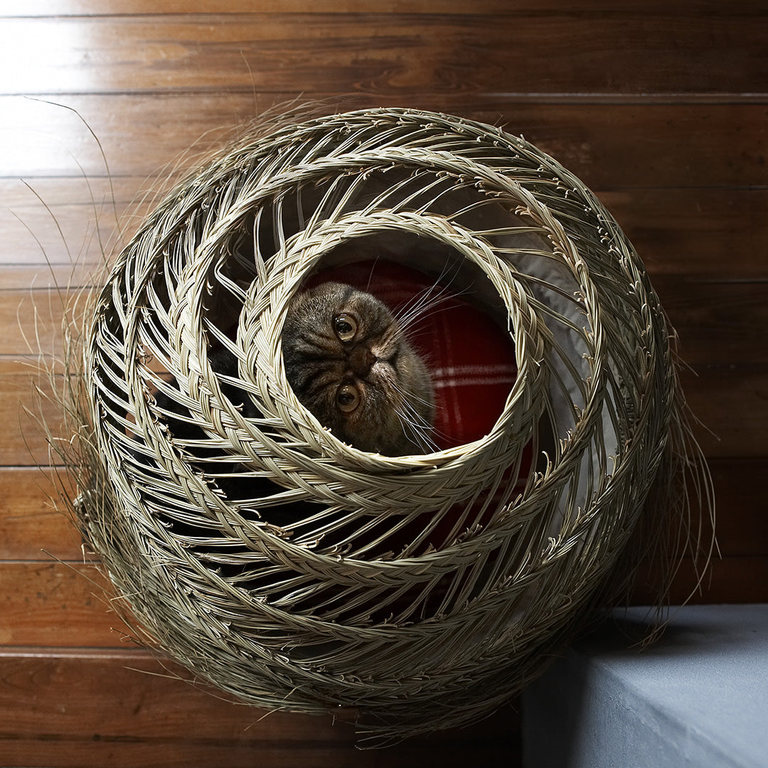 モロッコの天然素材Halfa(ハルファ)で渦巻き状に編み上げるランプシェードのデザインをベースに、ねこのおうち用にI AM A CATが完全オリジナルで制作しました。