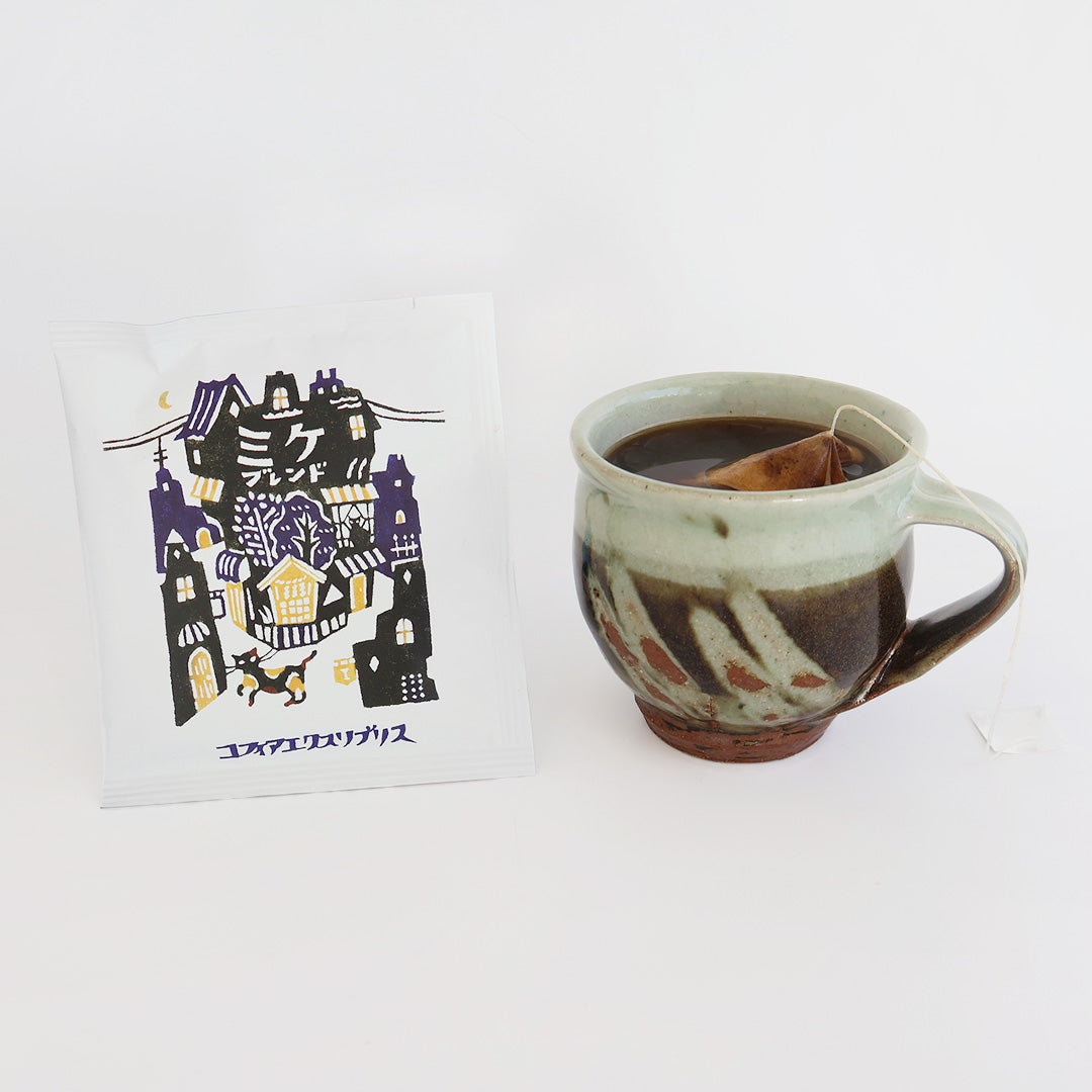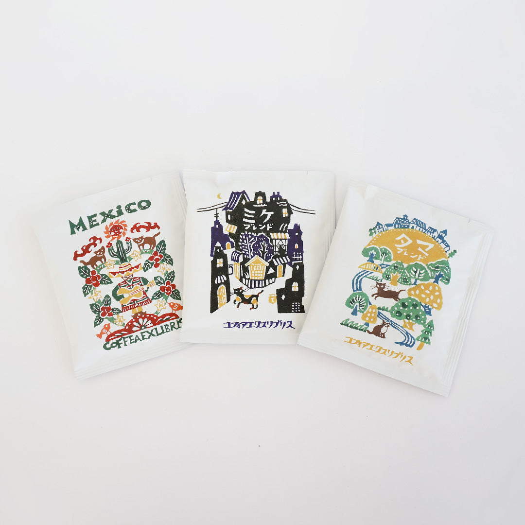 COFFEA EXLIBRISさんの数ある美味しいコーヒーの中から、今回はミケブレンド、タマブレンド、そしてメキシコ・ディカフェ深煎りを3つセットにしてドリップパックサイズの巾着とともにお届けいたします。