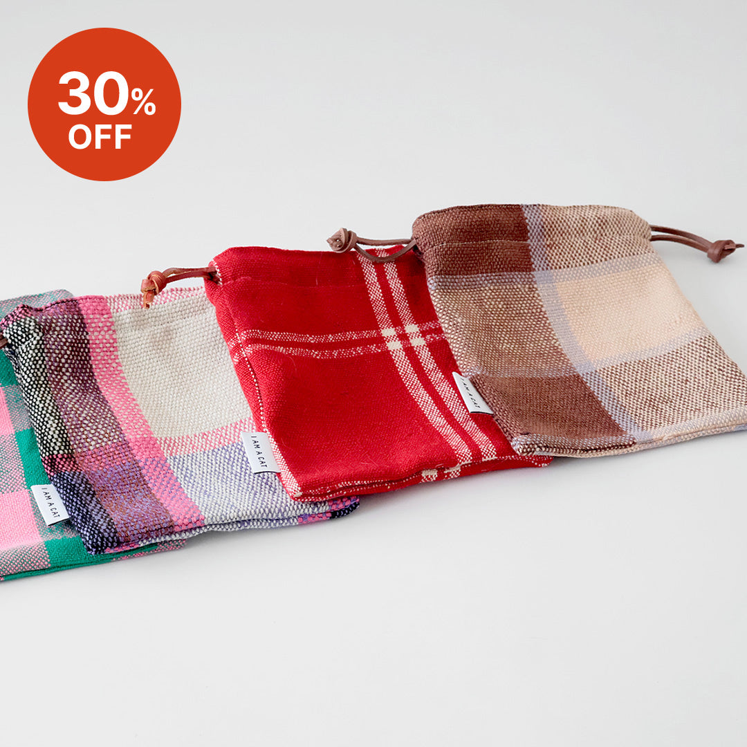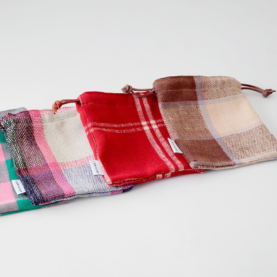 巾着は、モロッコのベルベル人女性によって手織りで作られた布(ハイク)を使ってひとつひとつ手作りしたオリジナル商品です。