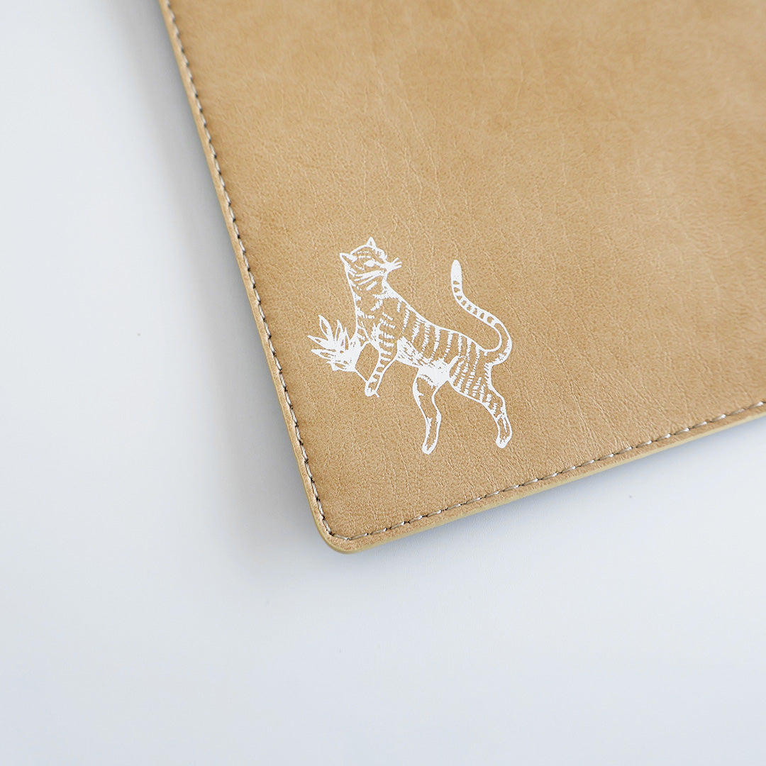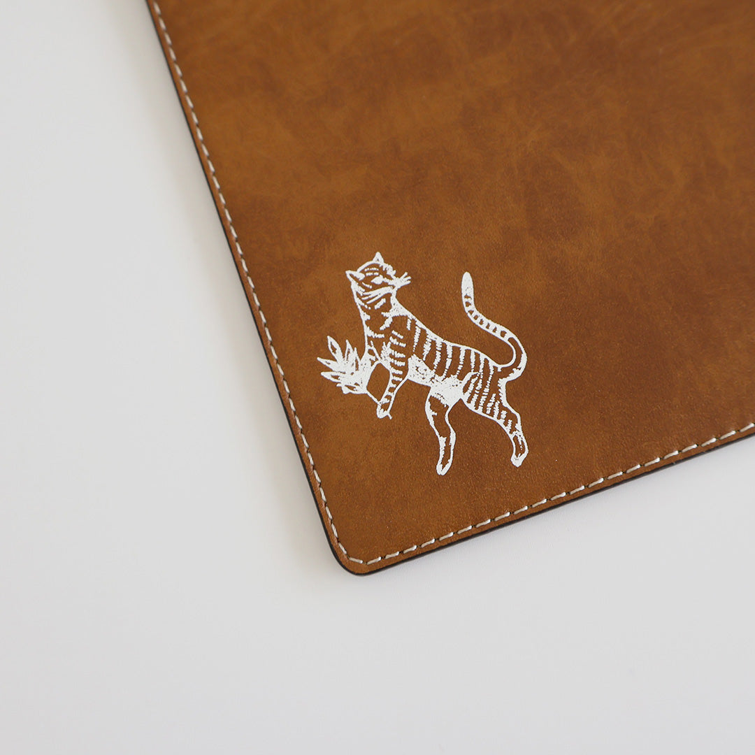 裏表で色が異なるリバーシブルとなっていて、キャメル×ブラックとカーキ×ベージュの2色展開です。裏表で箔押しのデザインも異なるお得感満載のマルチマットです。