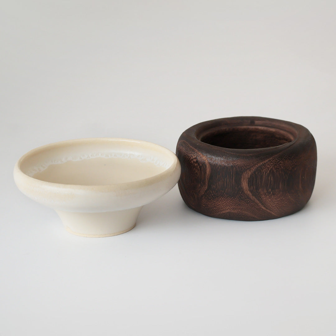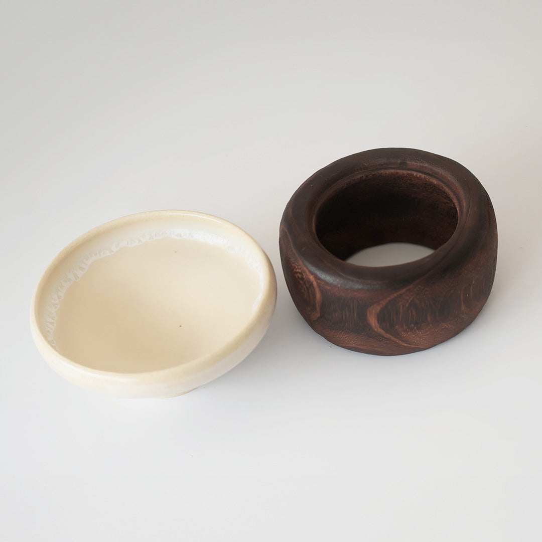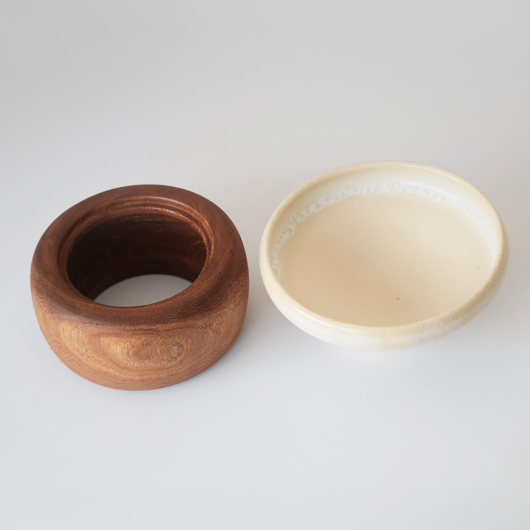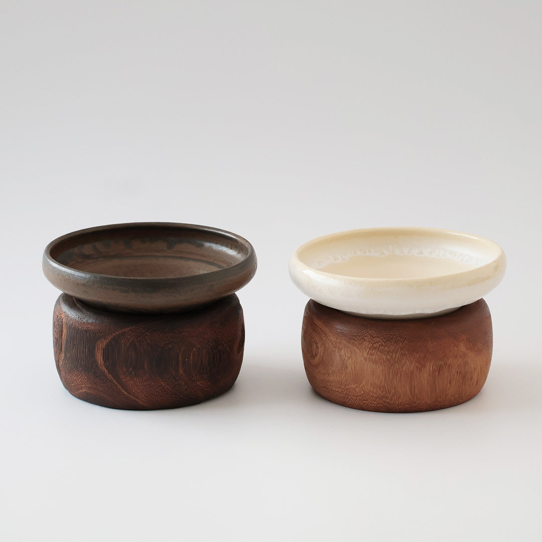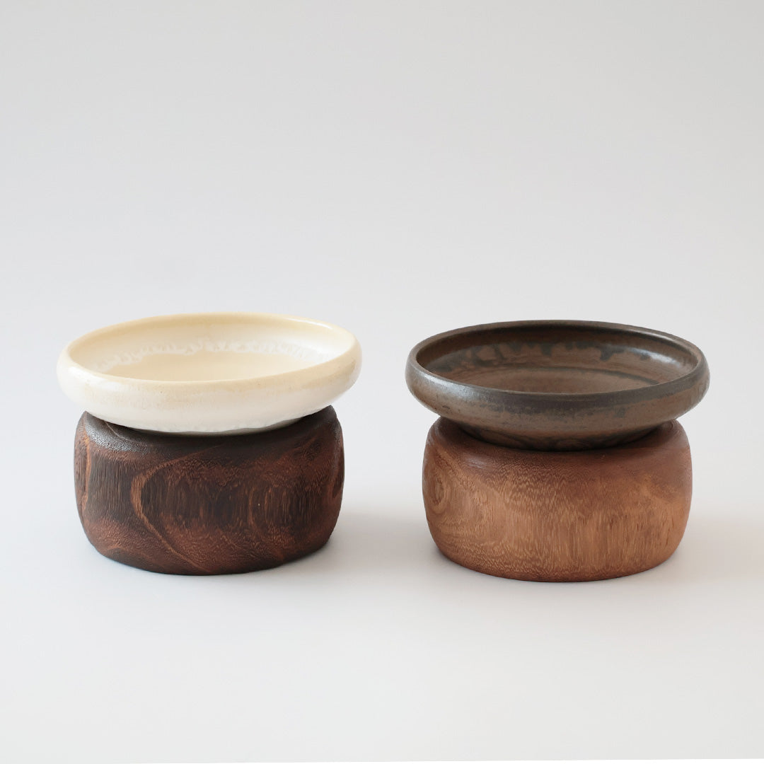 ごはんのうつわは、やわらかく温かみのあるホワイトの「白鳳」と、落ち着きと深みのある「瀬戸黒」の2色。どの組み合わせも、木と陶器のバランス感が最高です。