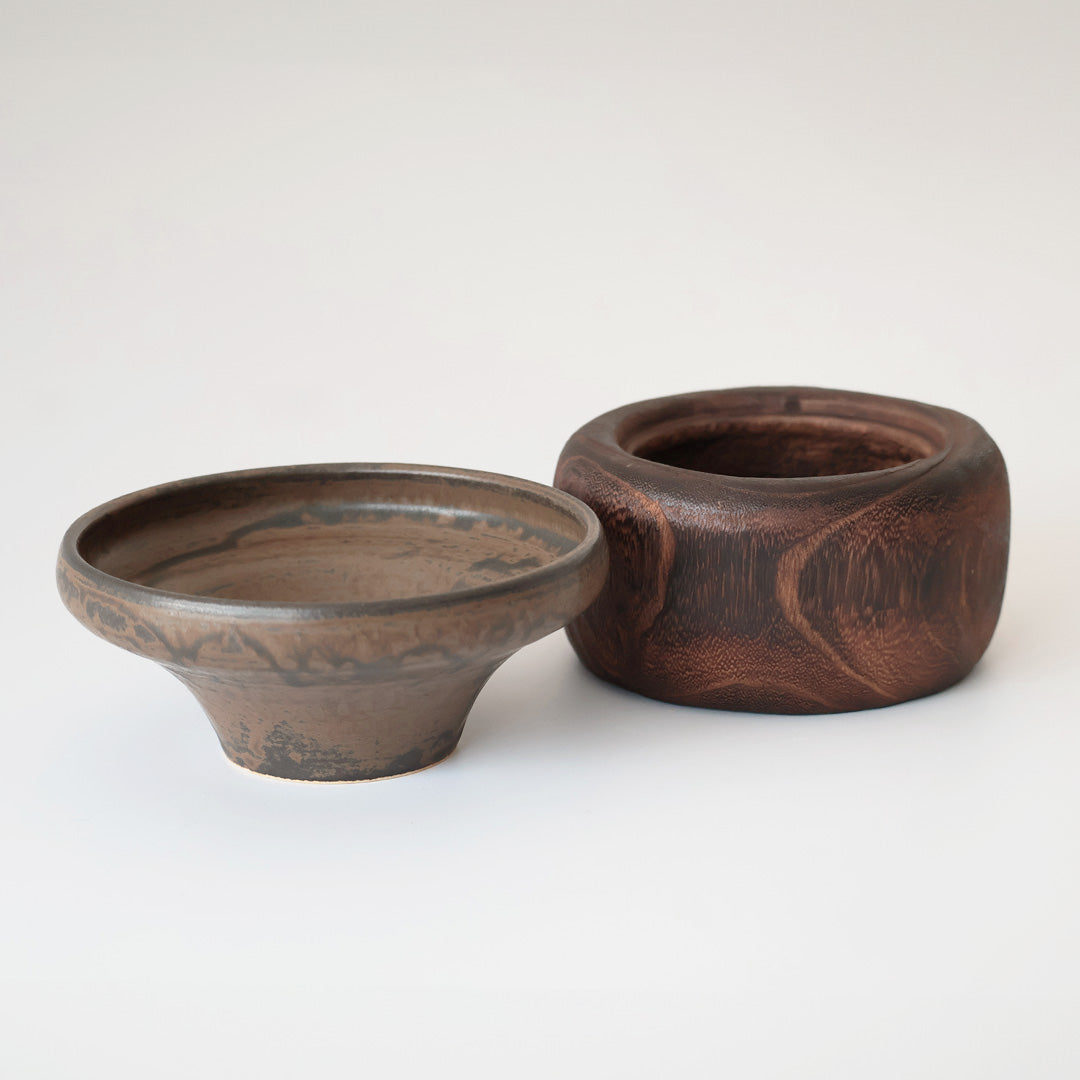 桐鉢は、丁寧に磨き上げて塗装を施した明るめのお色「ライトブラウン」と、表面をバーナーで焼いて、丁寧に磨きあげ塗装した深みのあるお色「ダークブラウン」の2色をご用意。